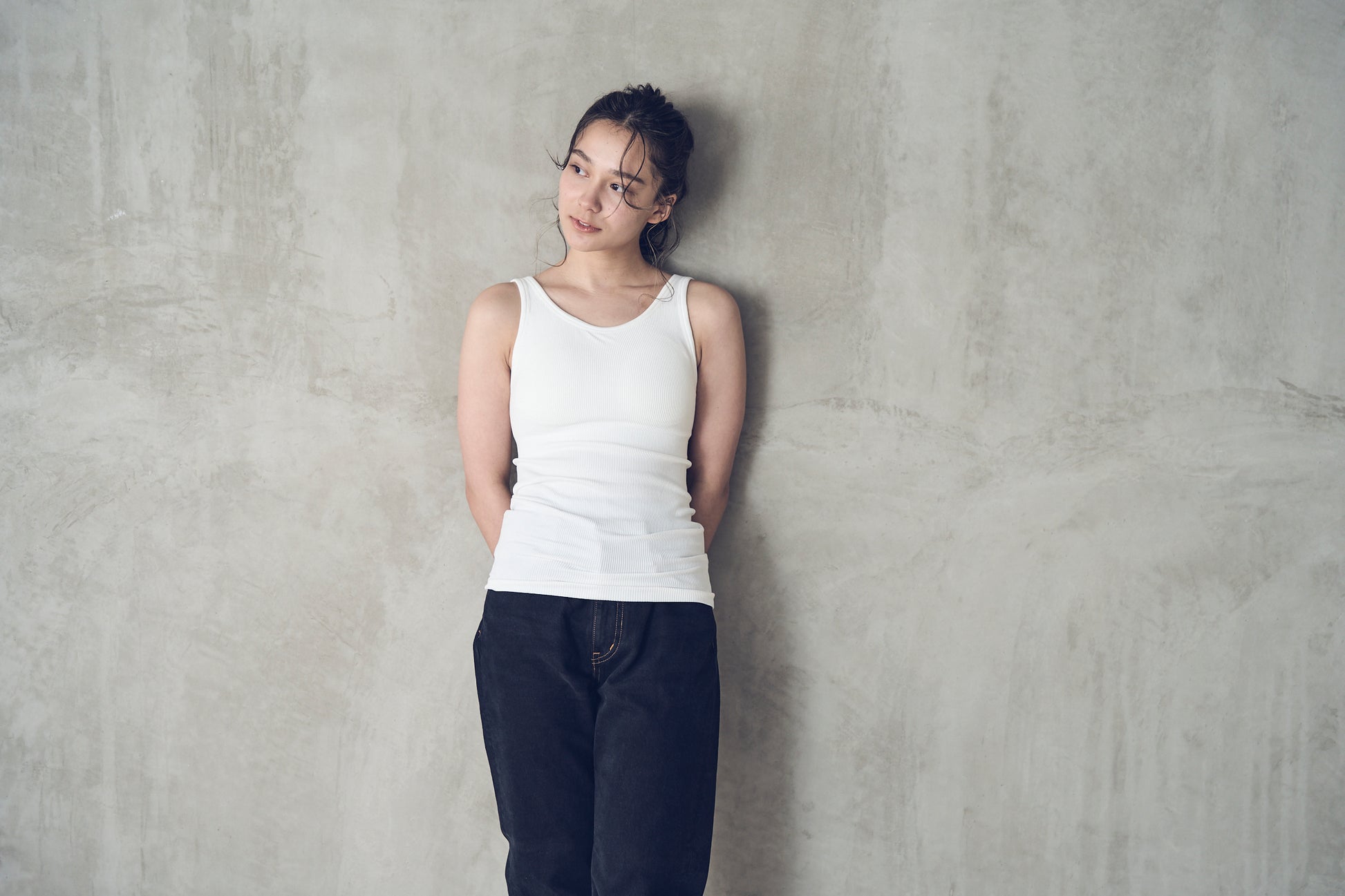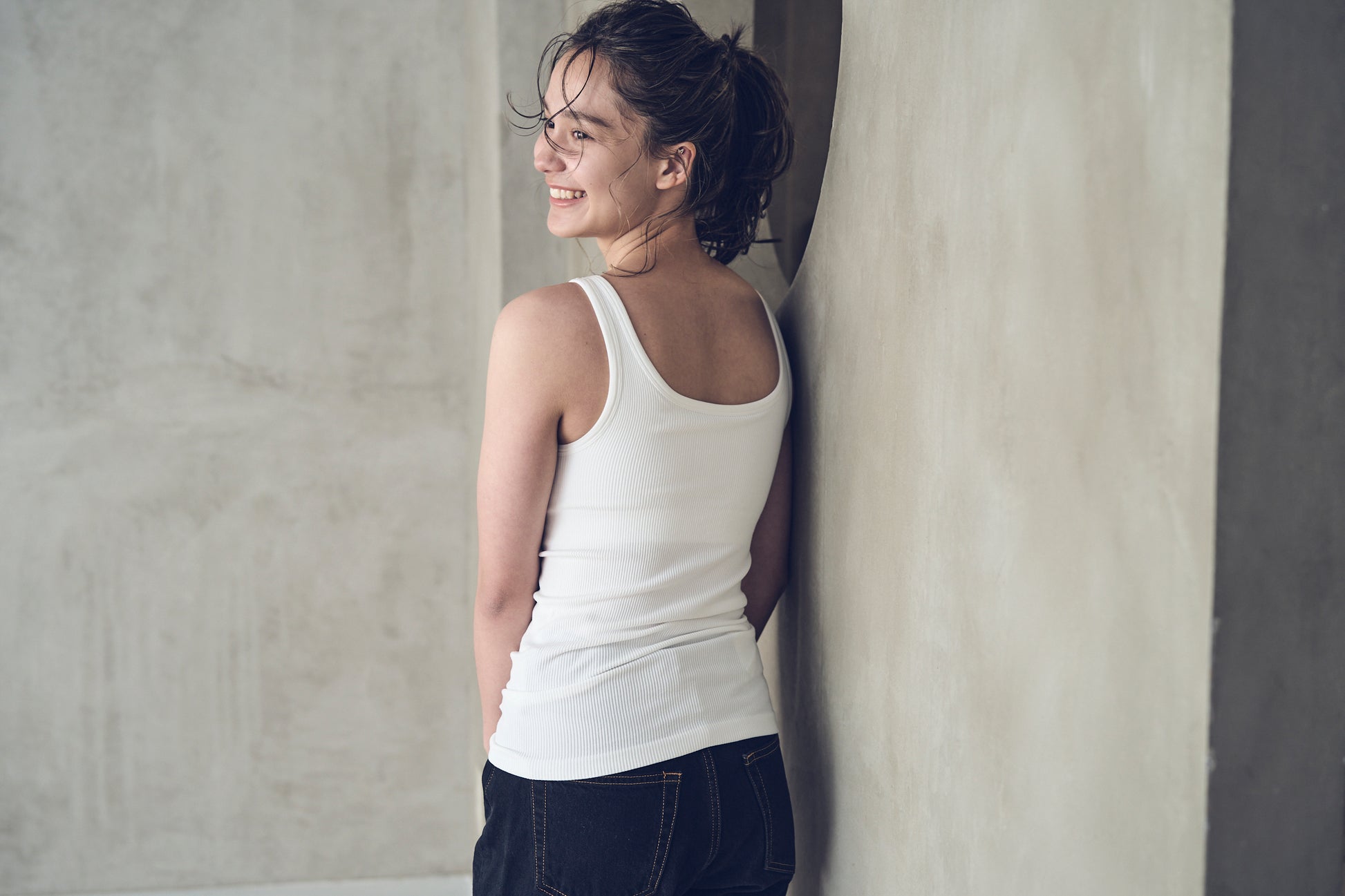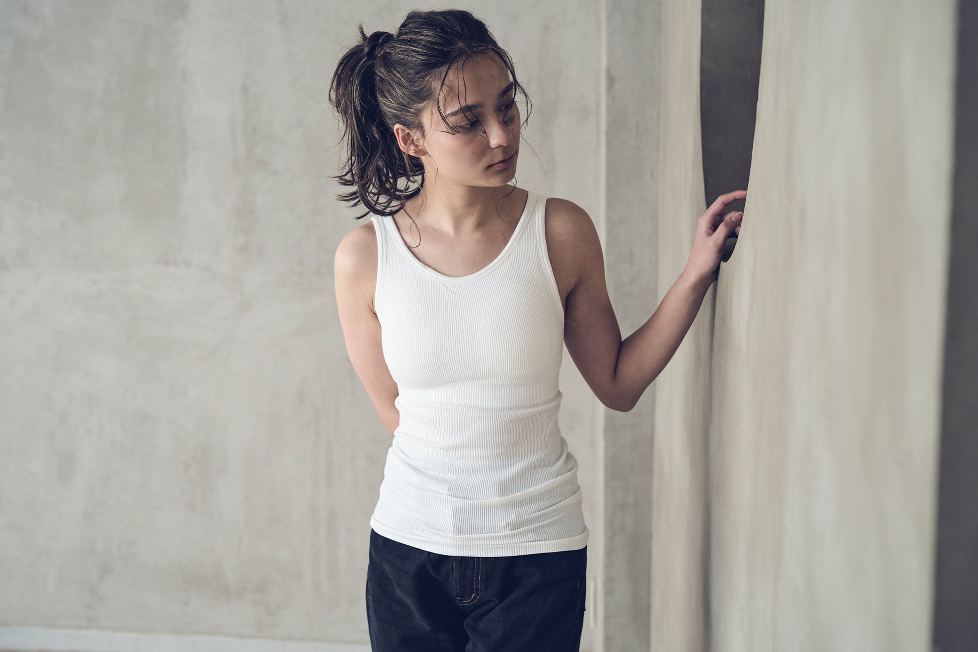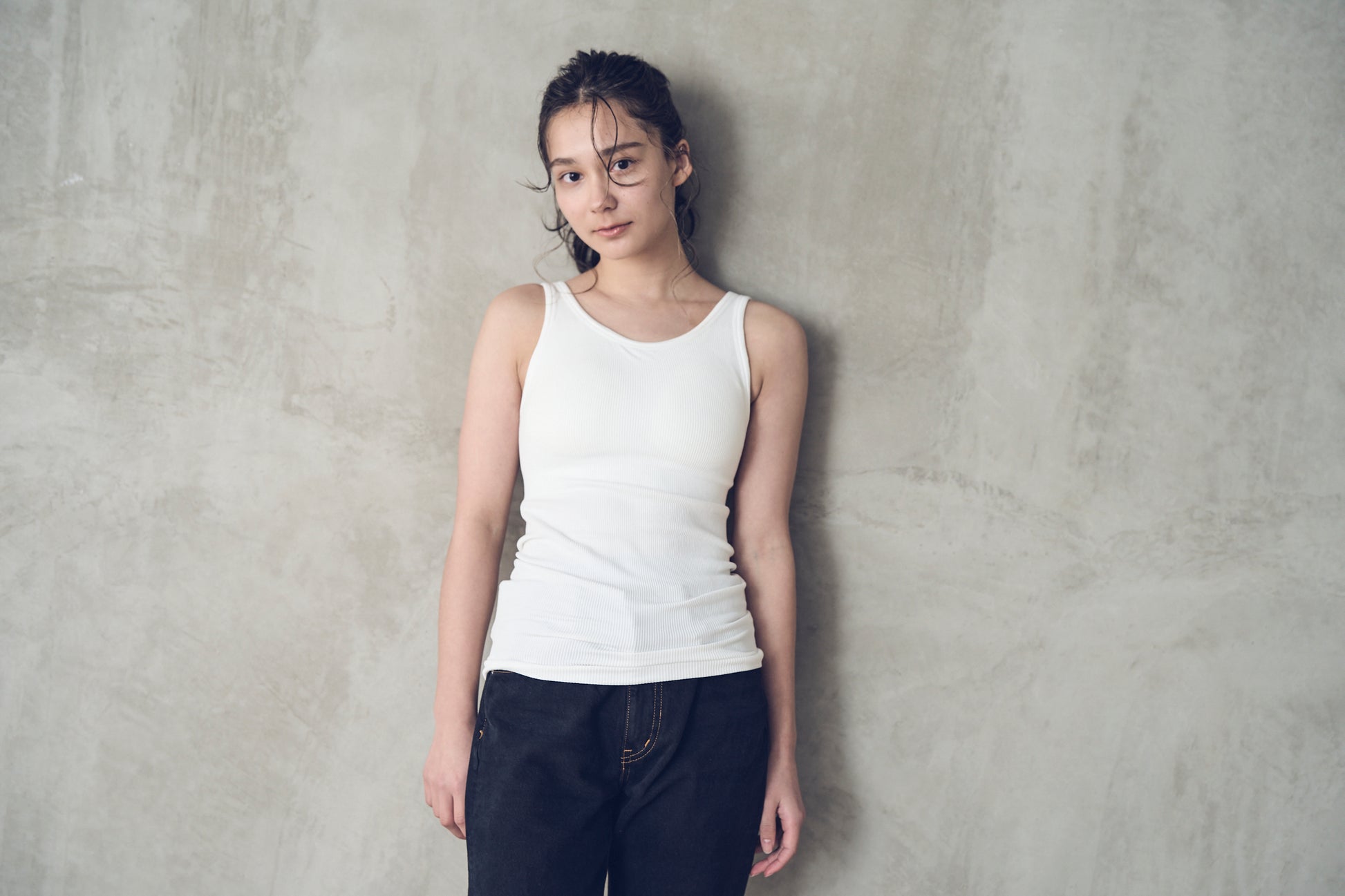 コットンを混ぜることで通気性を高めた、薄手で柔らかい手触り。胸をしっかりホールドするよう、スタンダードコットンタイプよりもゲージを太めに仕上げました。