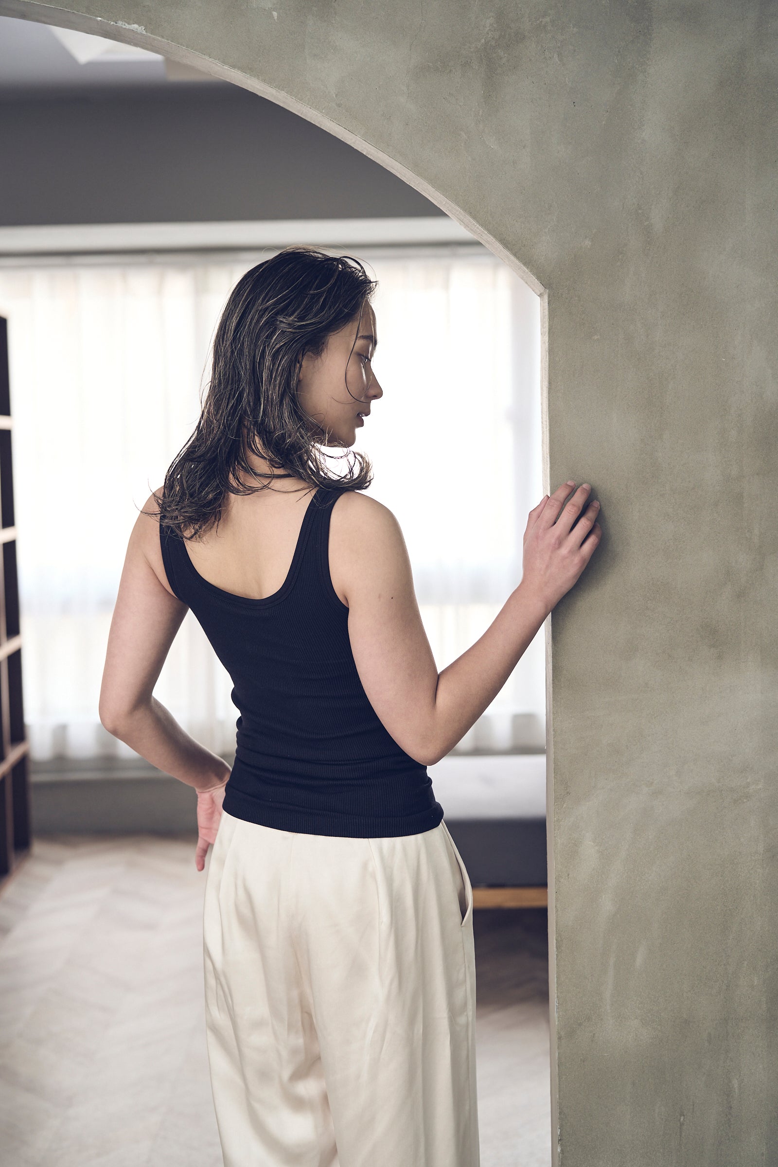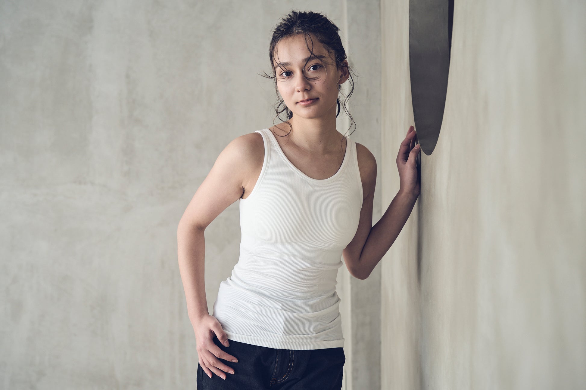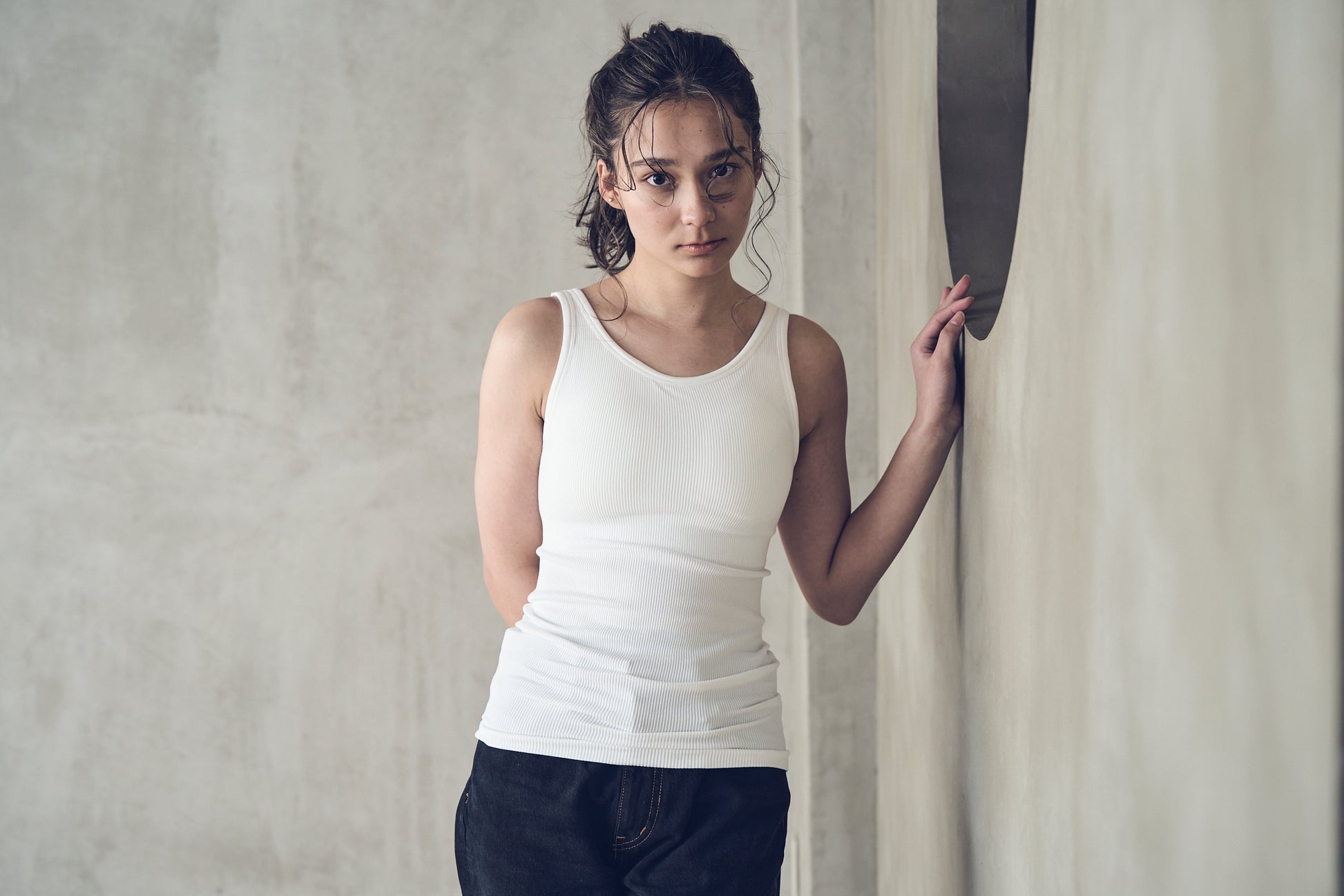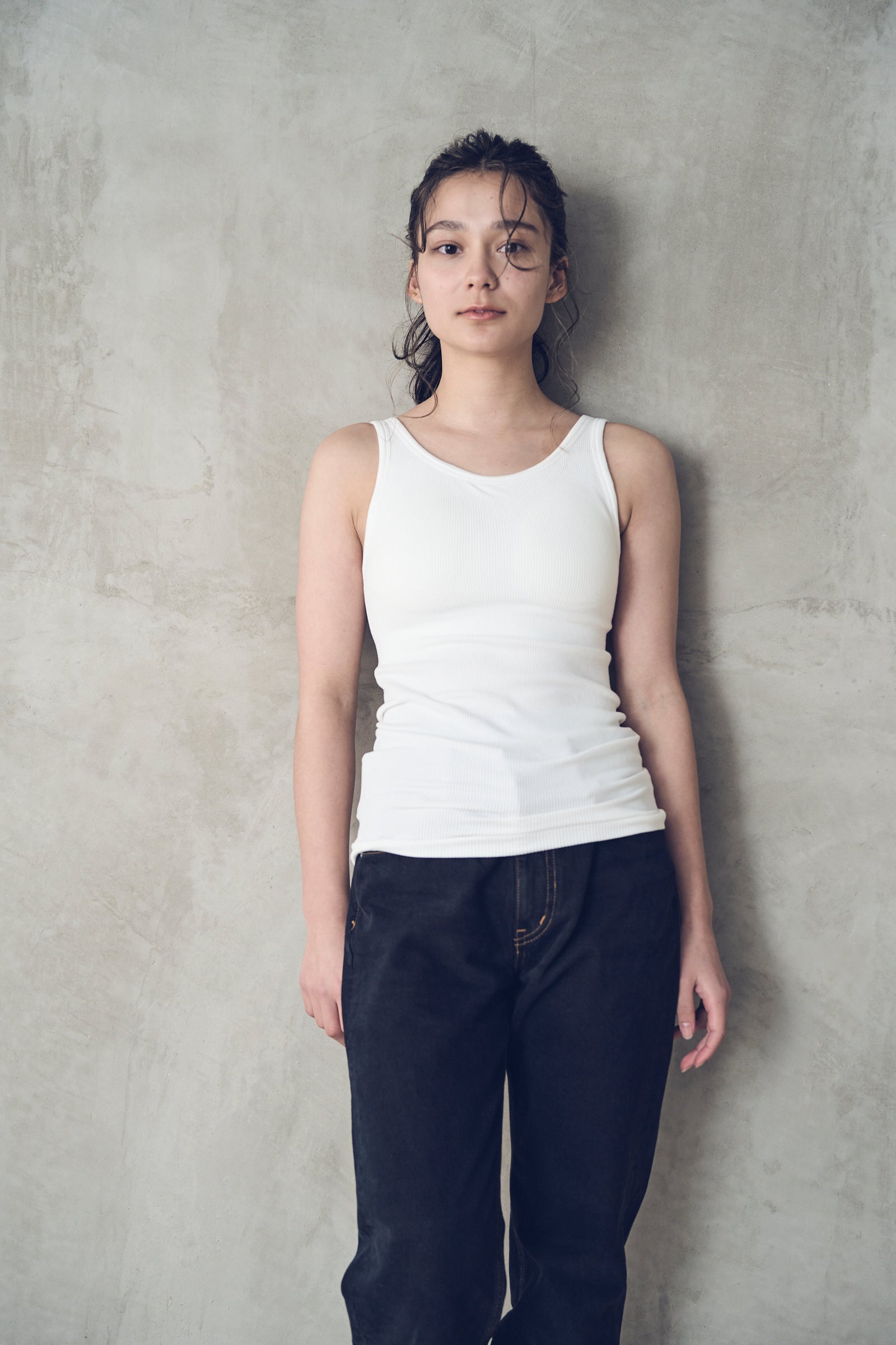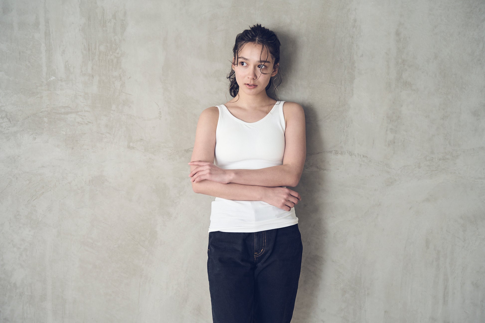 コットンを混ぜることで通気性を高めた、薄手で柔らかい手触り。胸をしっかりホールドするよう、スタンダードコットンタイプよりもゲージを太めに仕上げました。