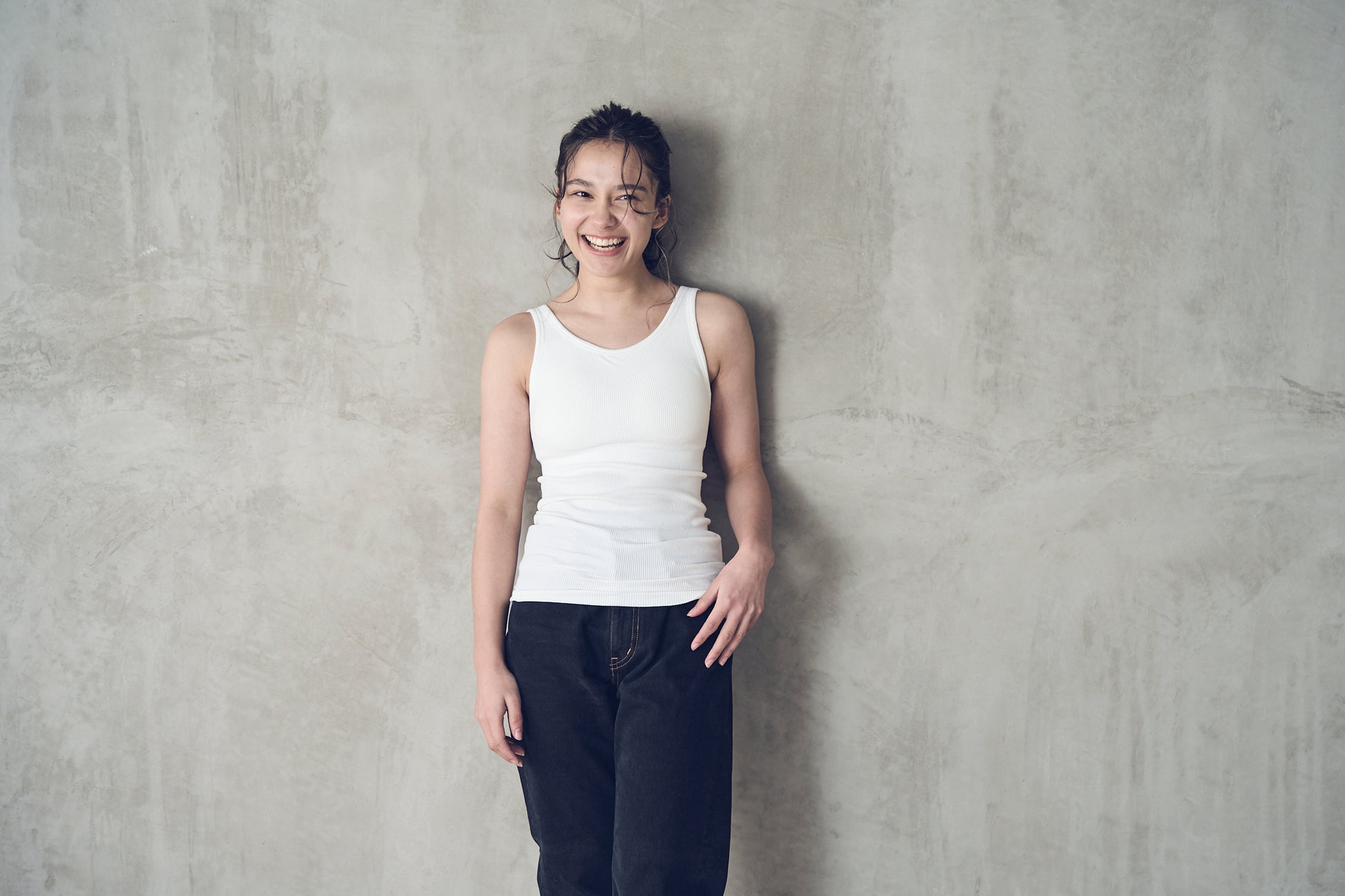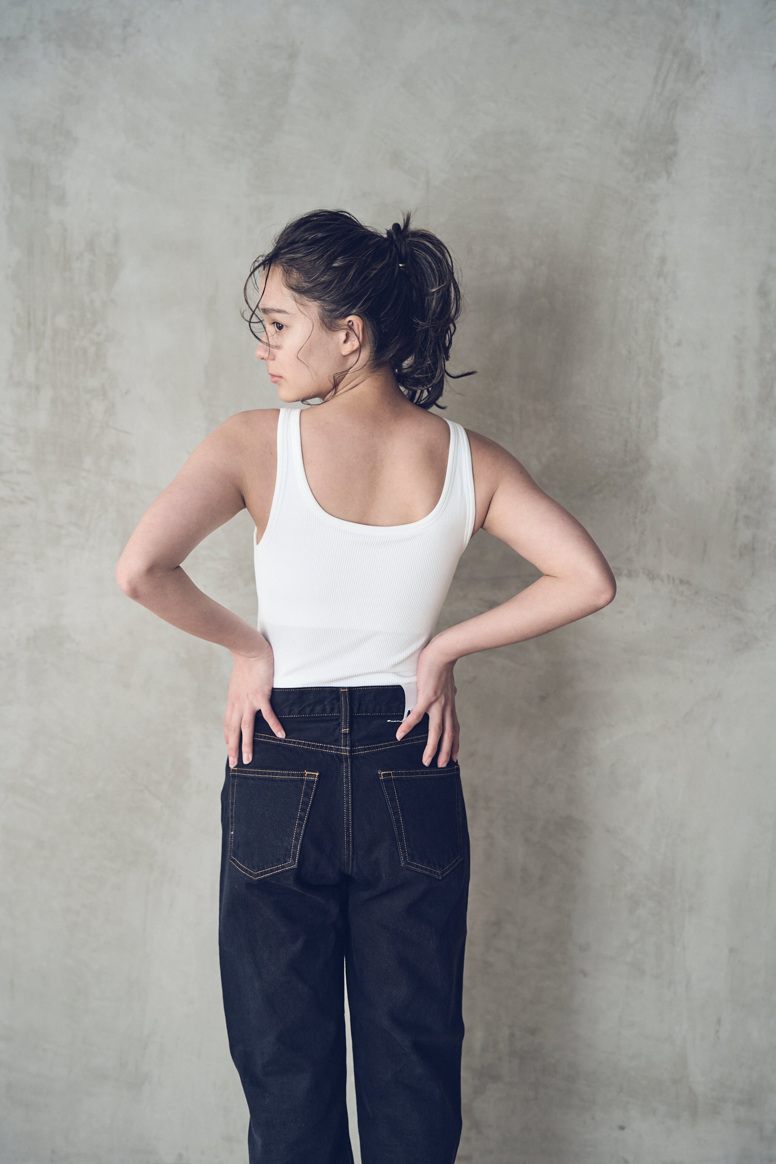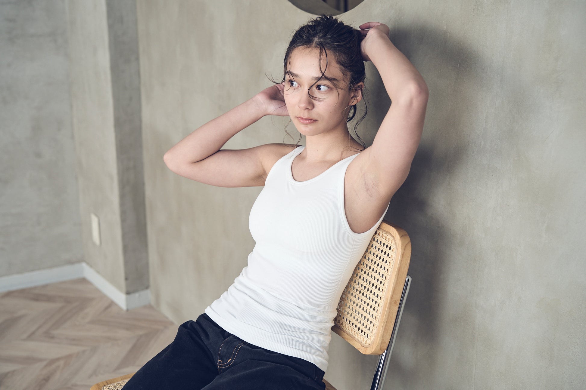 スタンダードよりも胸元のあきを狭くし、谷間が見えづらいシルエットに。脇や背中の空きも少し狭めました。
