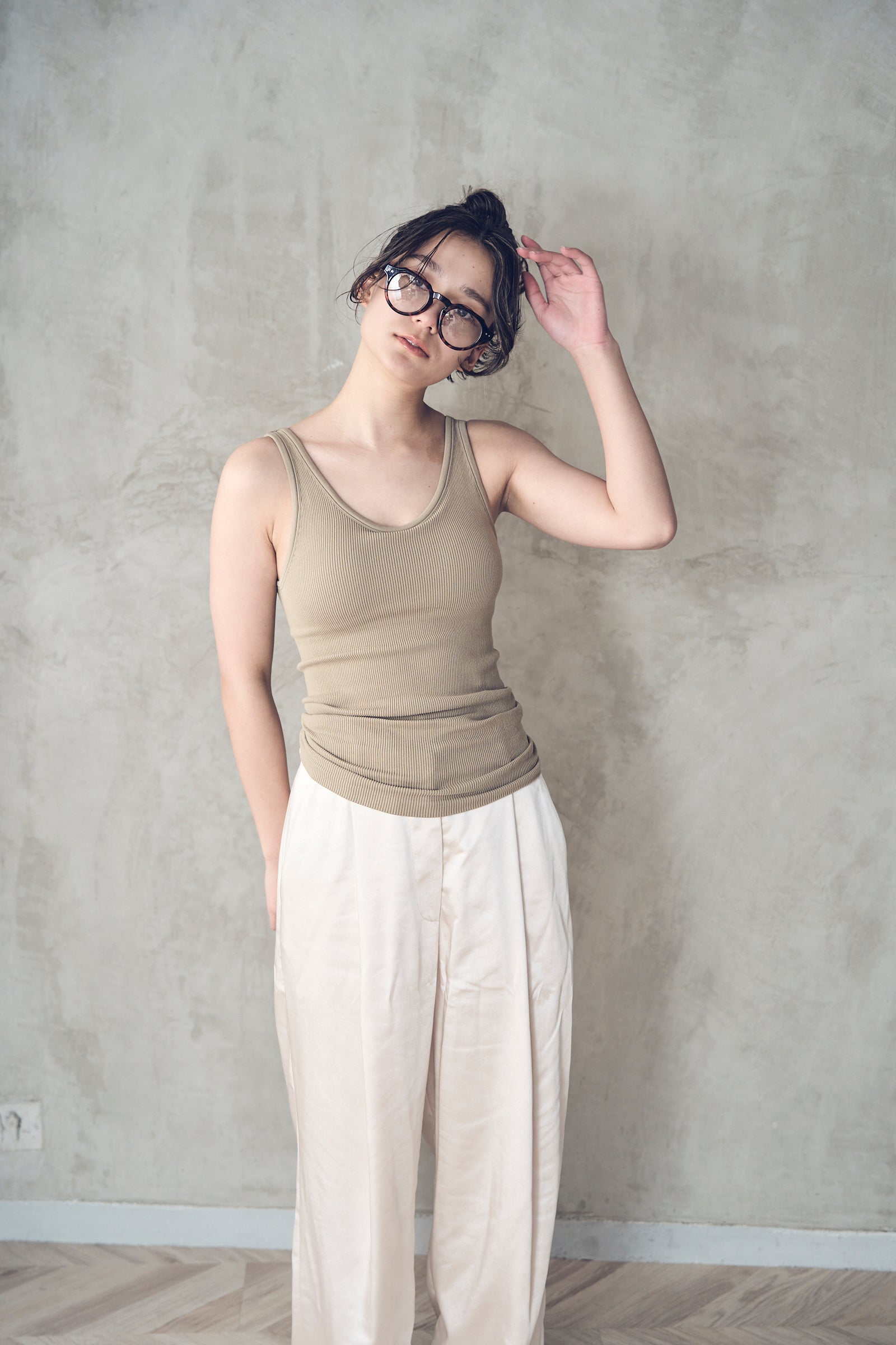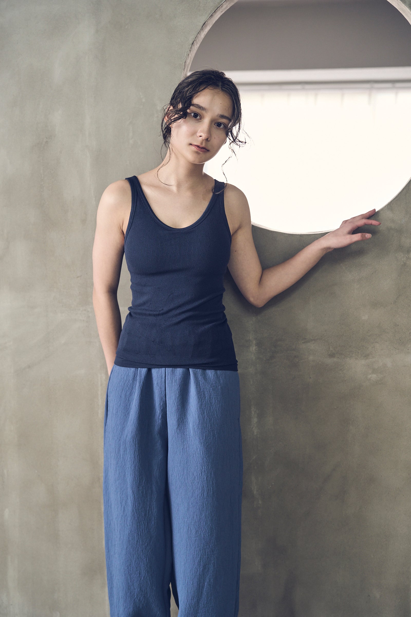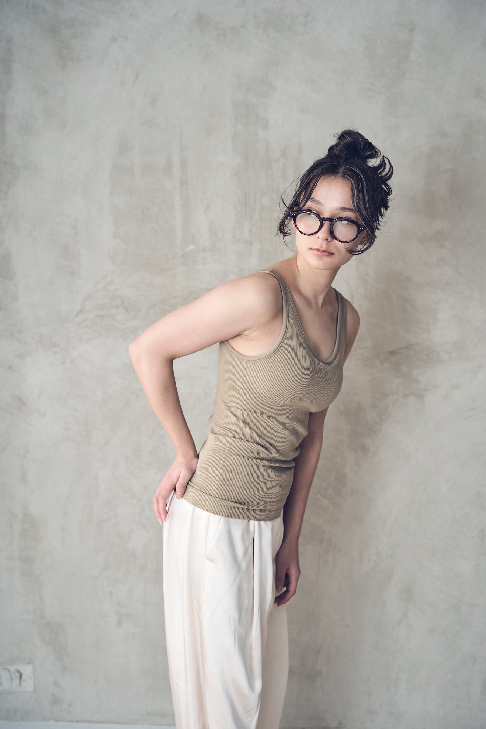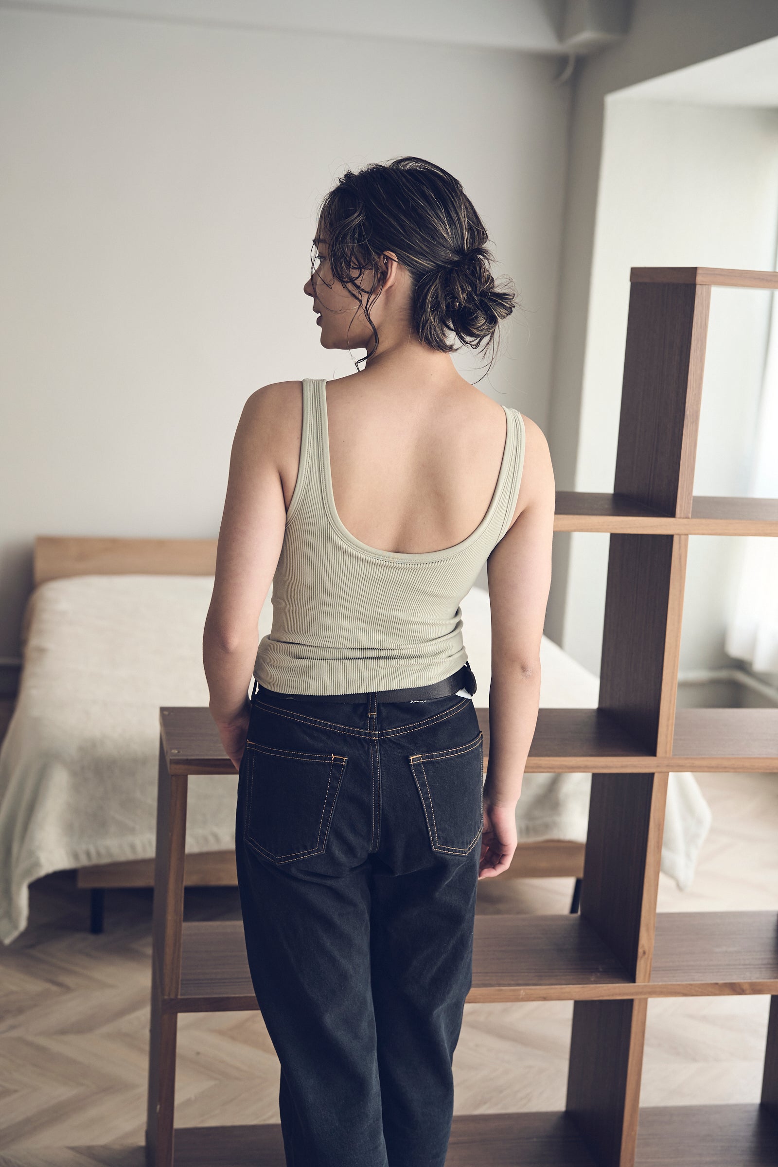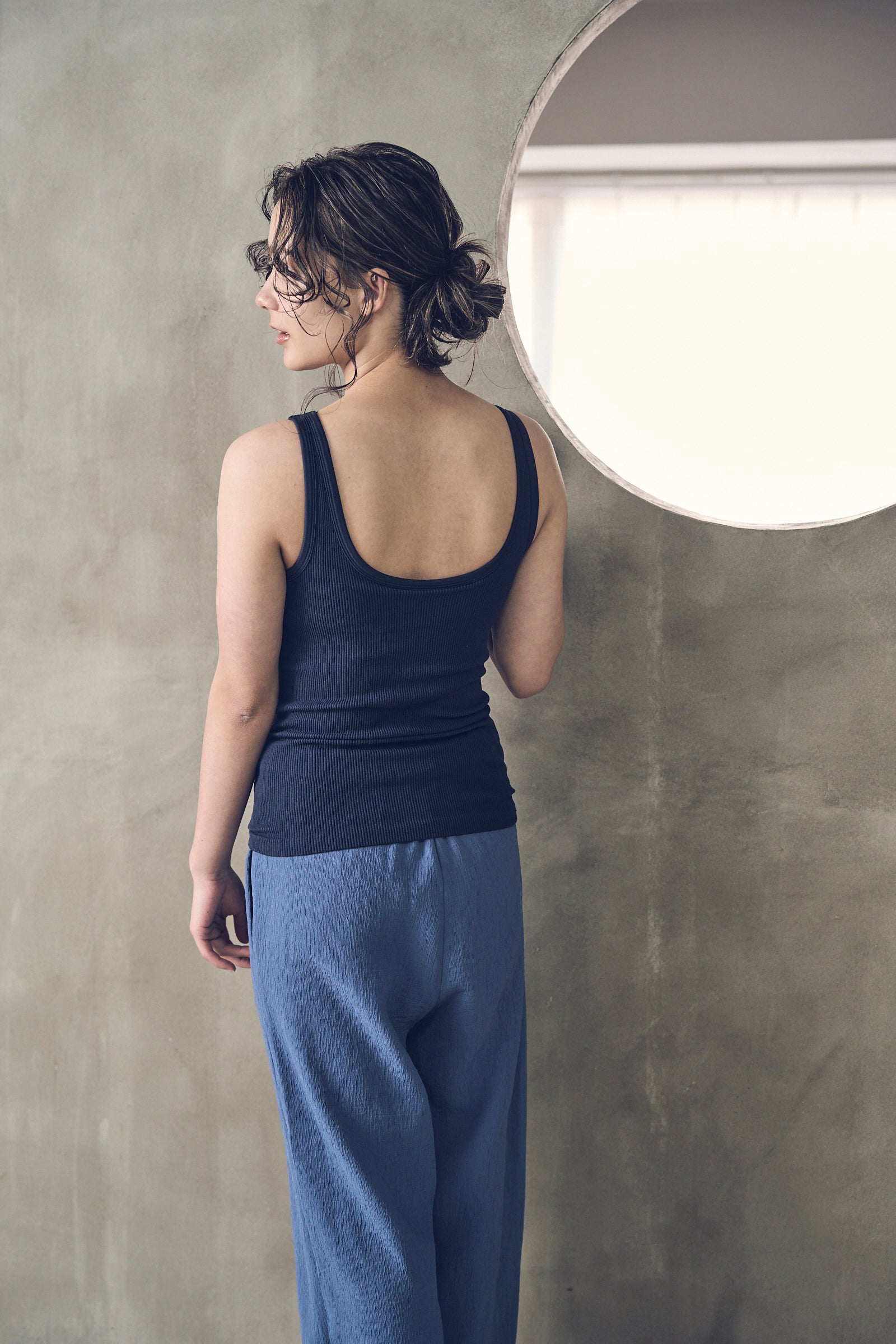 背中や胸元の空きを調整し、どんなお洋服にも合わせやすいバランスにこだわりました。インナー見えしないリブ編みなので、あえて見せて着用することも可能です
