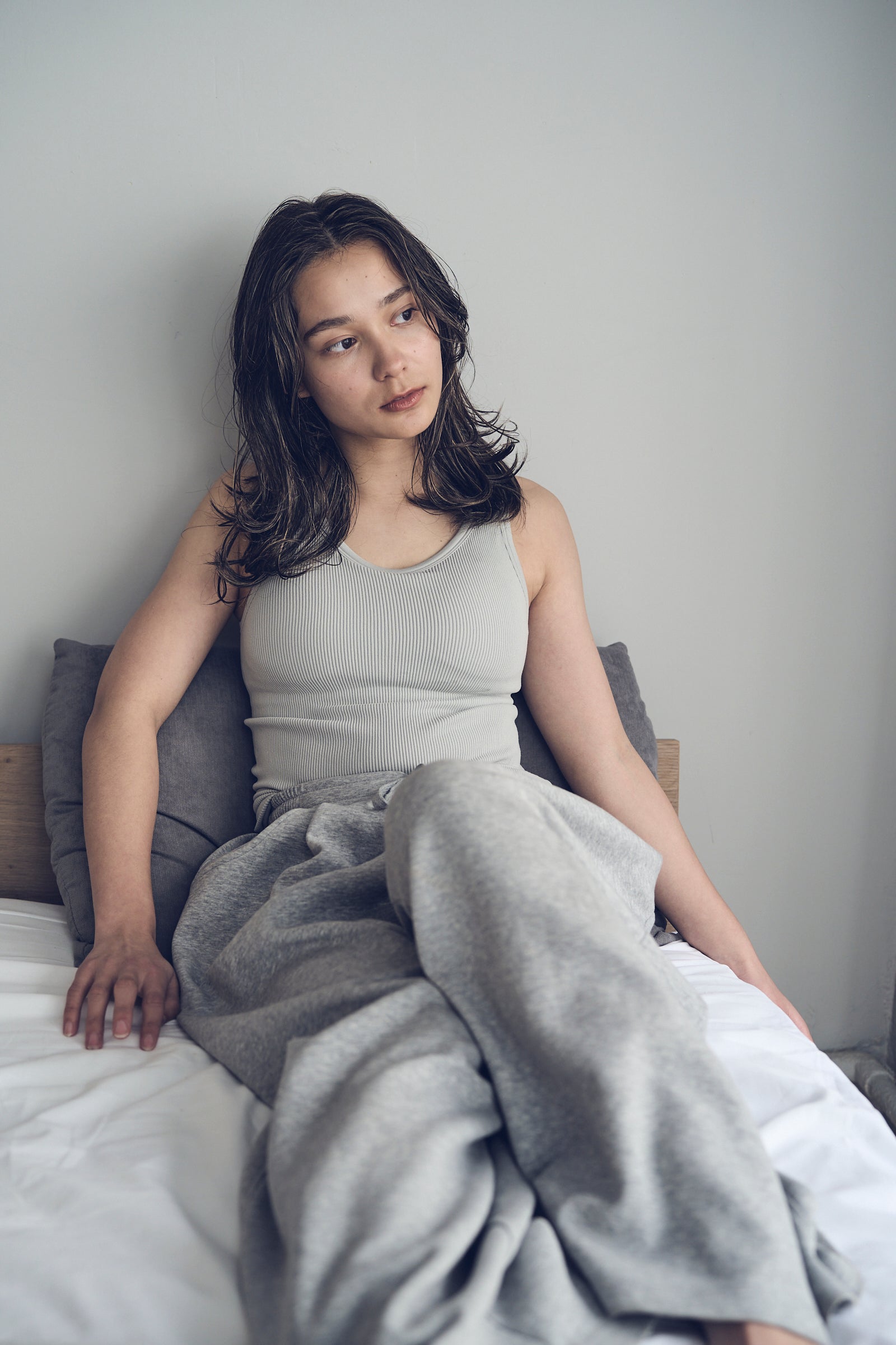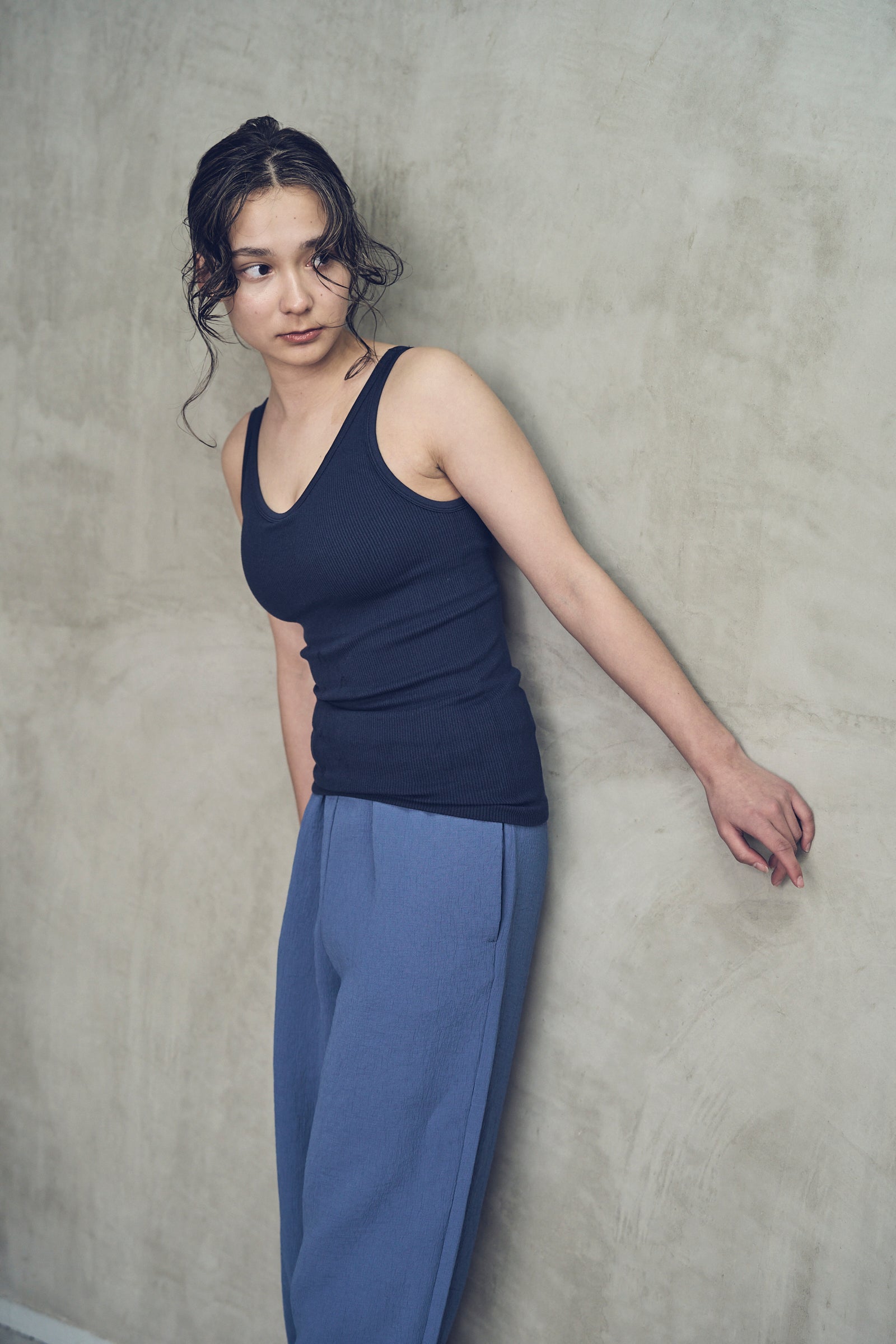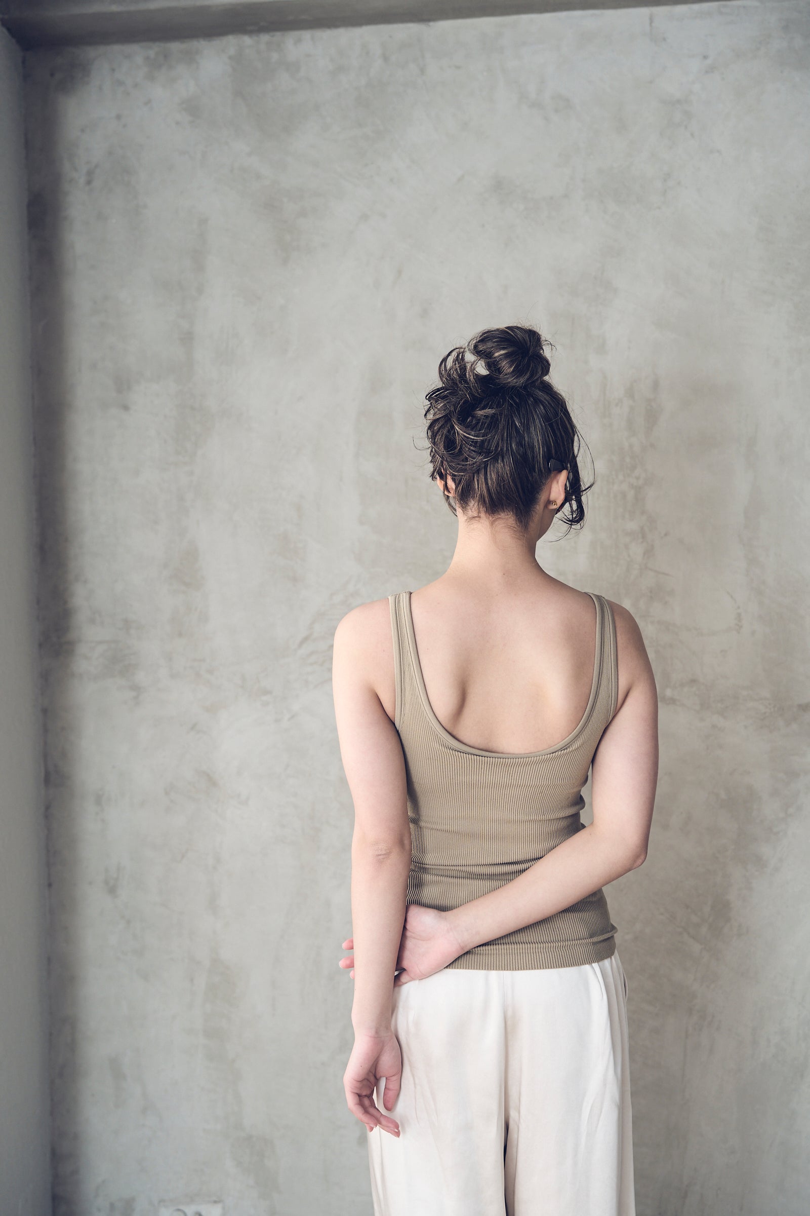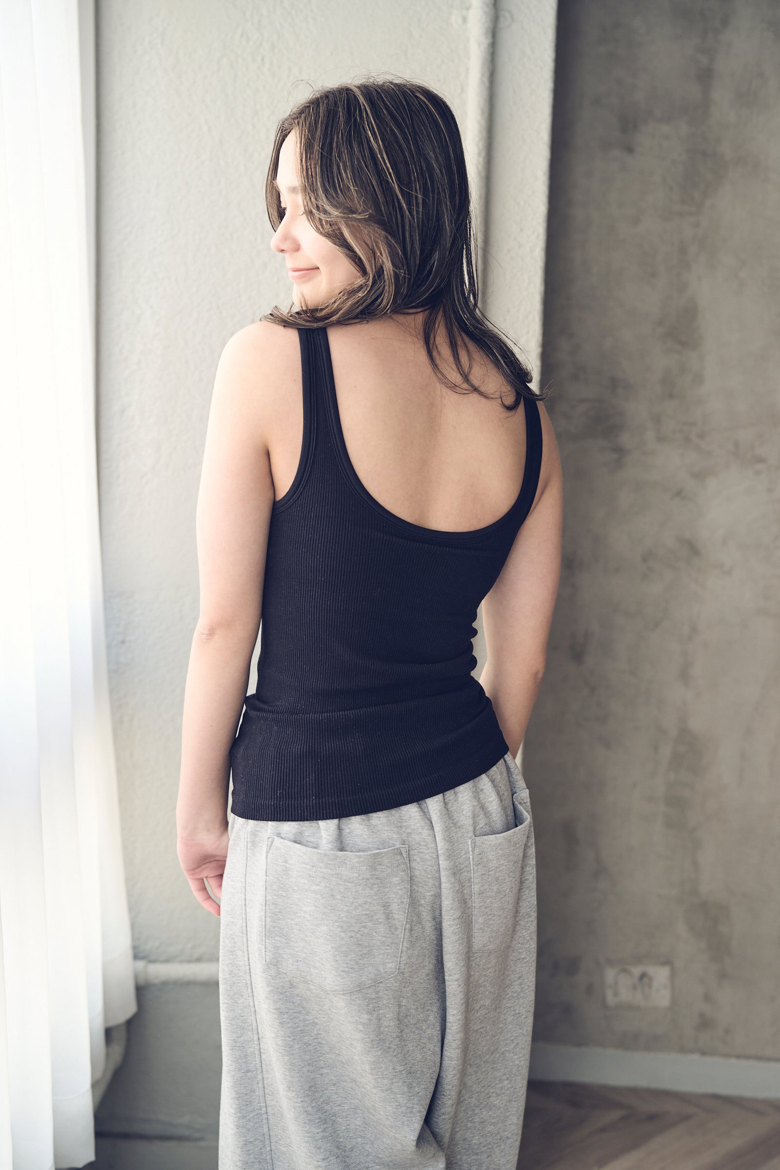 背中や胸元の空きを調整し、どんなお洋服にも合わせやすいバランスにこだわりました。インナー見えしないリブ編みなので、あえて見せて着用することも可能です